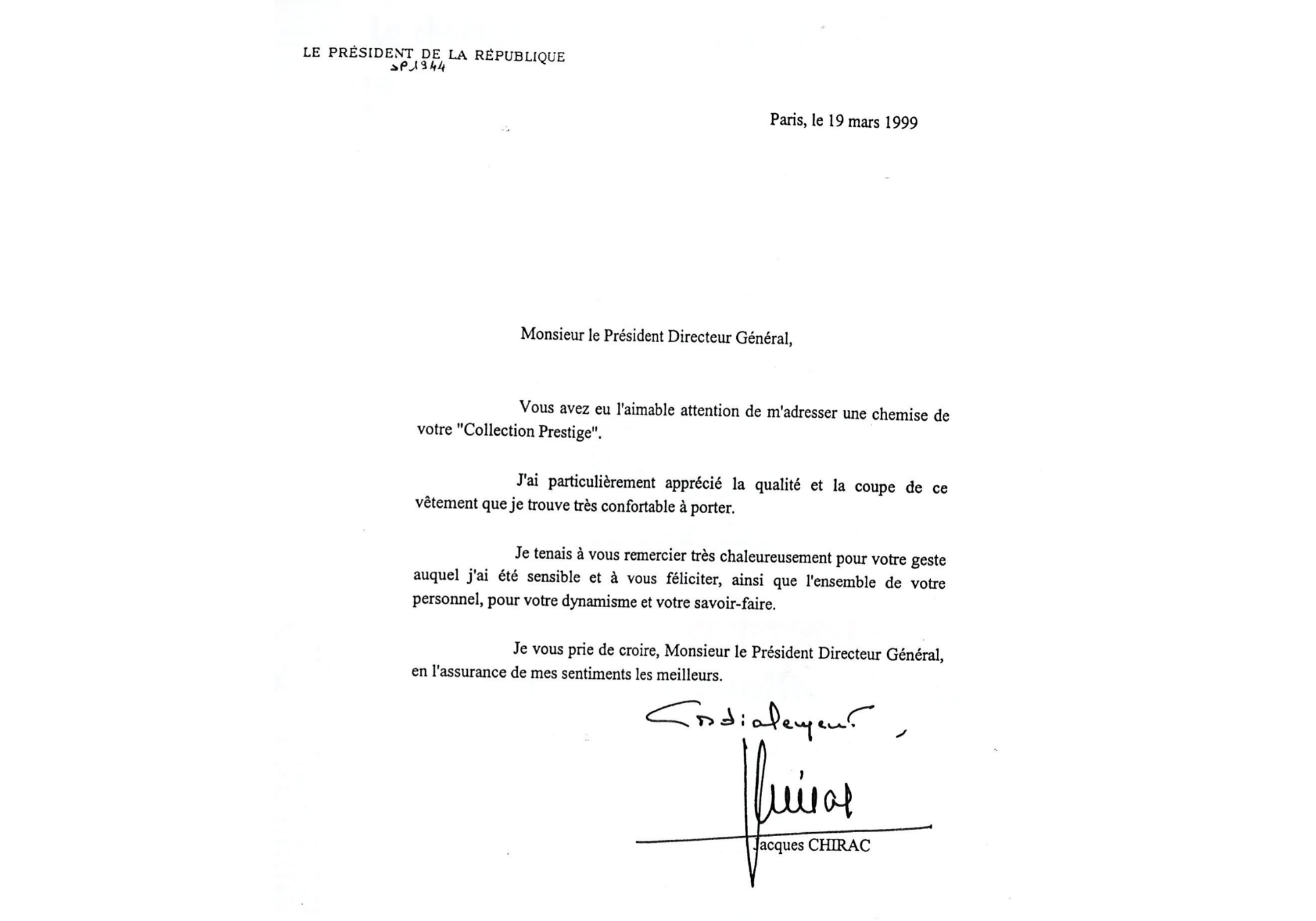 Dans une lettre officielle, il salue la qualité et la coupe des chemises Gauthier. Notre Collection Prestige est née.
